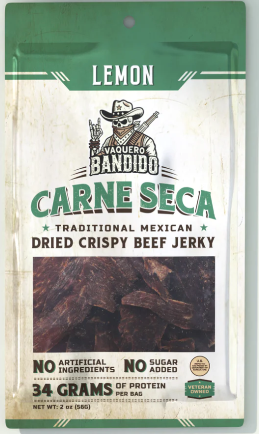 Carne seca — traditional Mexican dried crispy beef jerky. Bright lemon cuts through the richness. The most refreshing flavor in the lineup.